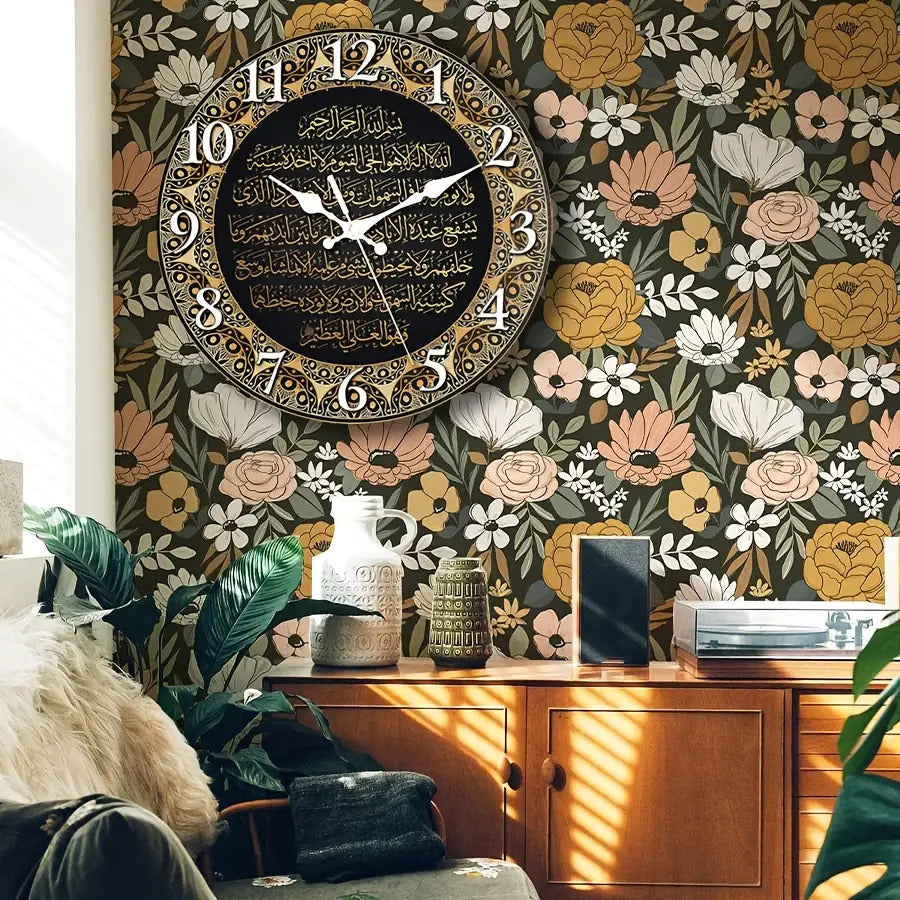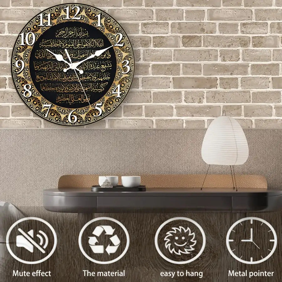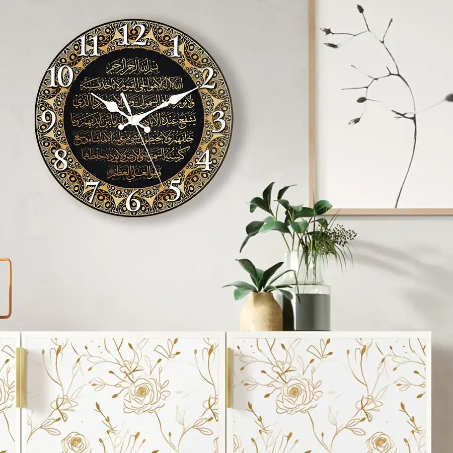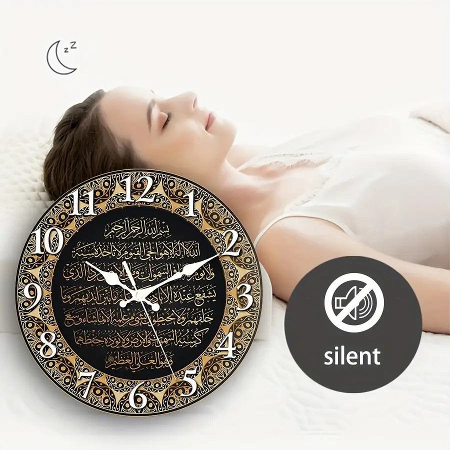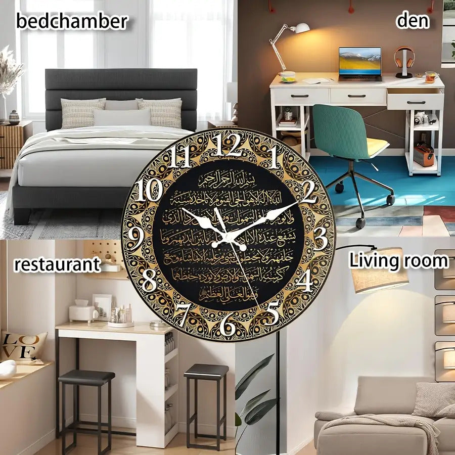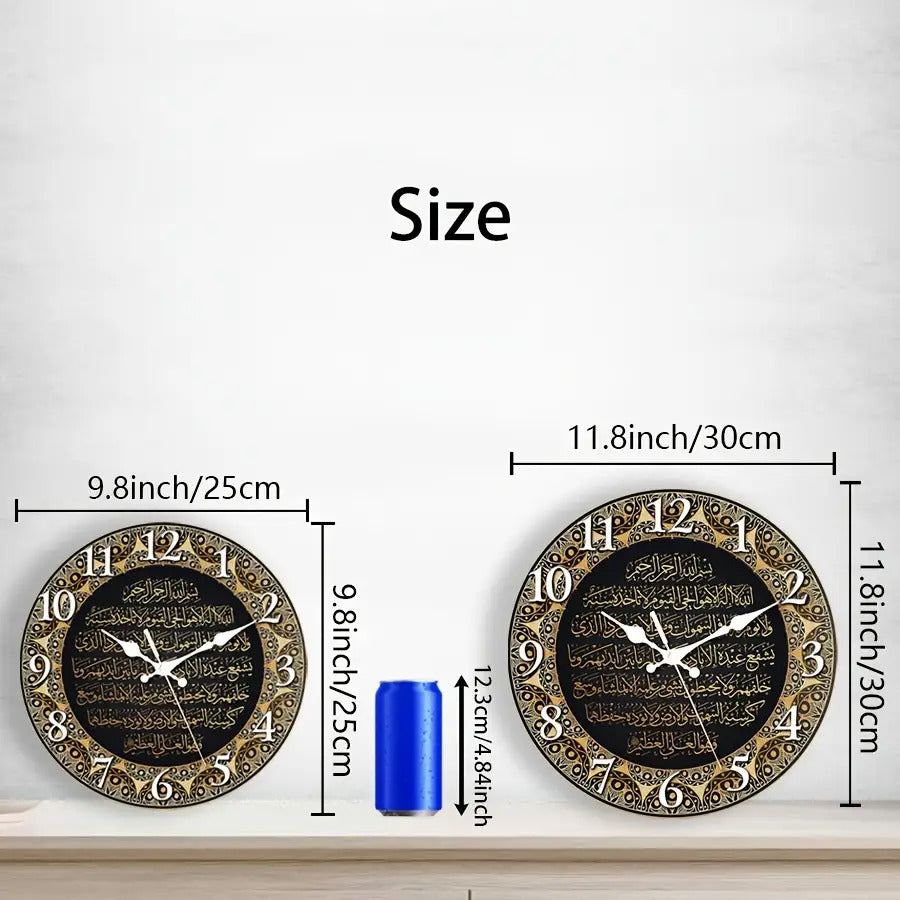 حركة كوارتز صامتةبدون دقات، عقارب ذهبية وقرص أسود مع نص عربي أبيض - أرقام كبيرة سهلة القراءة، مناسبة للمنزل والمكتب وديكور المسجد - مثالية