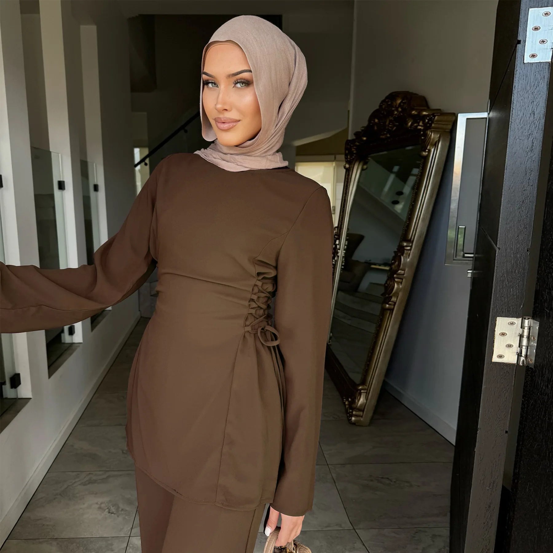 alalar | Two-Piece Modest Outfit Set – Lace-Up Blouse & Wide-Leg Pants (Ramadan & Eid)